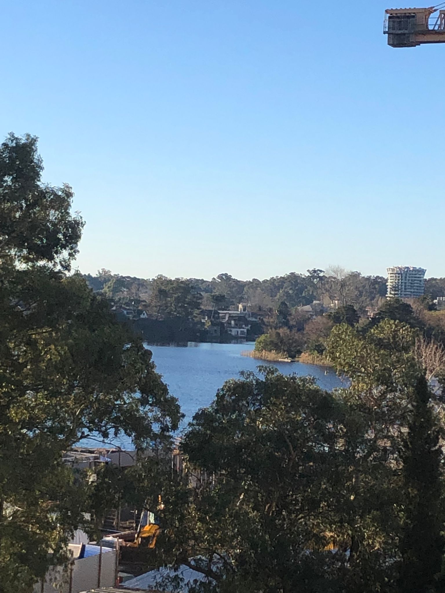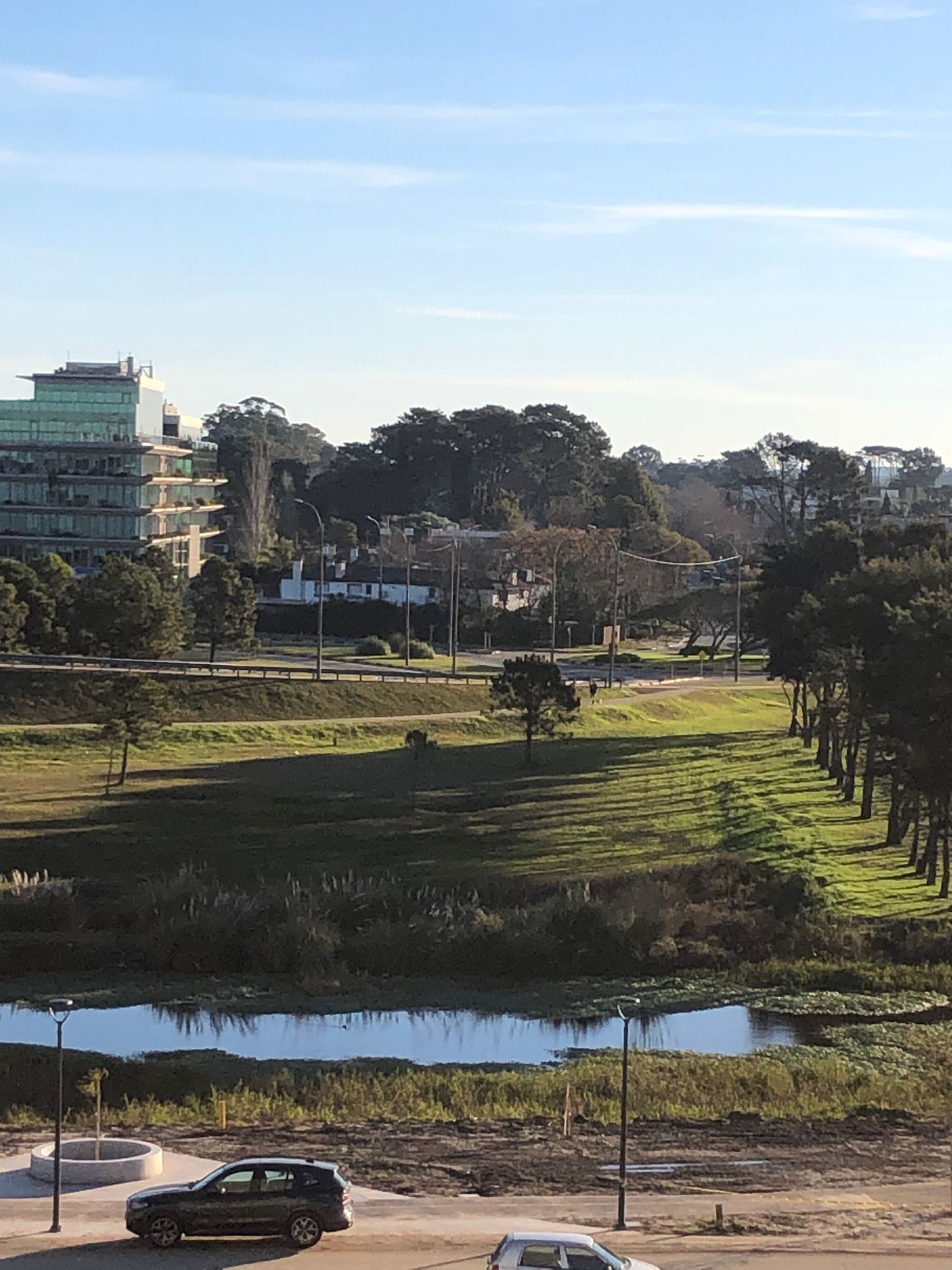 Vista al lago, parque y atardeceres despejados.
